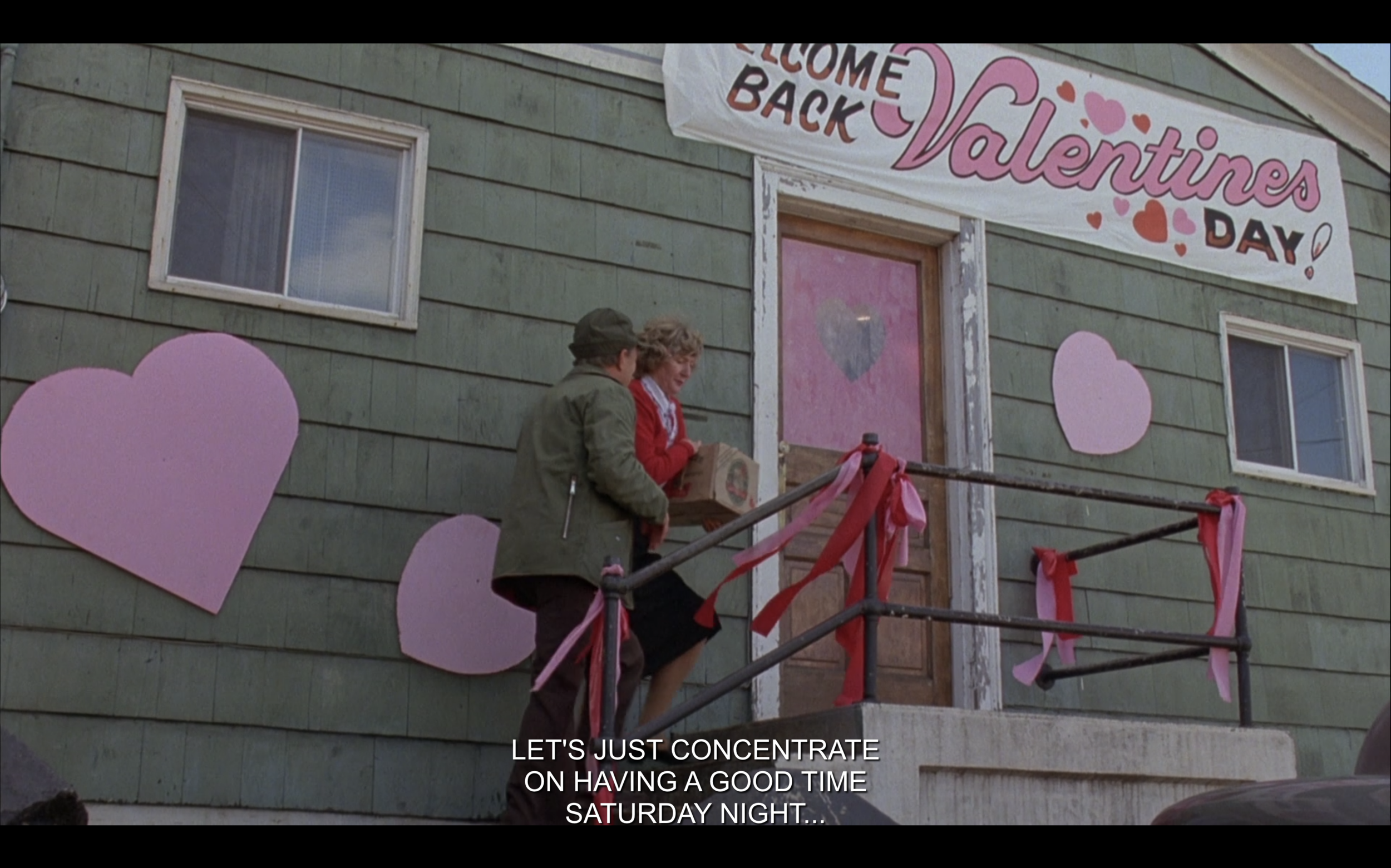 Set in a town called Valentine’s Bluffs, the film opens a few days before Valentine’s Day, which will be celebrated for the first time in several years. We first hear the backstory from the local bartender, who warns a group of twenty-somethings to beware of this time of year. He says: